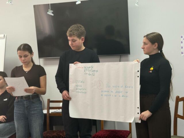 Pe 20 februarie, tinerii au participat la primul training, facilitat de Juraveli Dumitru. Subiectul central l-a constituit diferențierea dintre conflict, violență și bullying. Prin exemple practice și activități interactive, participanții au învățat să recunoască semnele timpurii ale agresiunii, să identifice tipurile de violență (fizică, verbală, emoțională, psihologică și online) și să înțeleagă impactul acestora asupra dezvoltării emoționale și sociale.