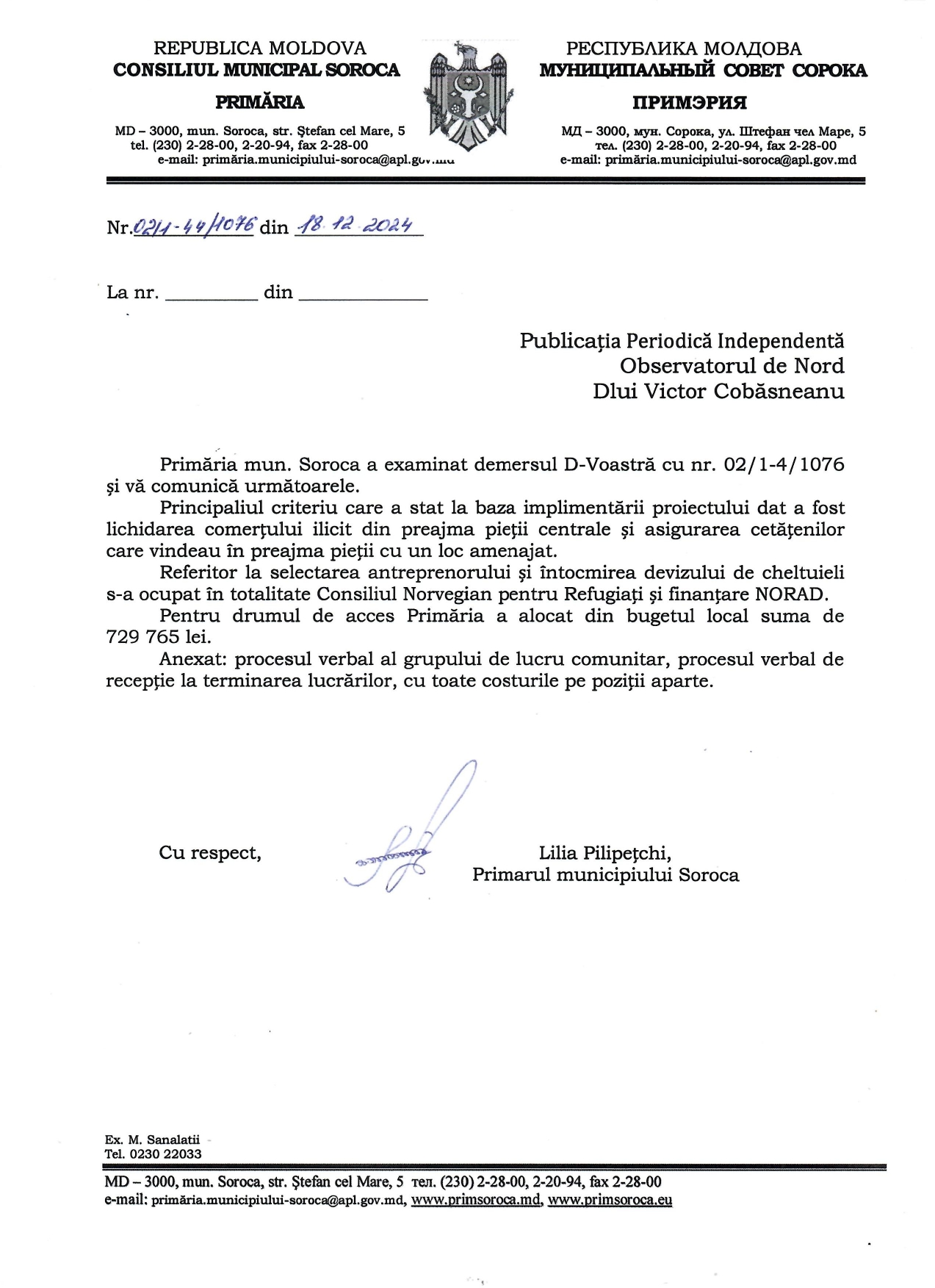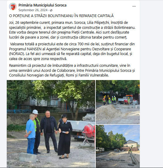 De asemenea, s-a menționat că selectarea antreprenorului și întocmirea devizului de cheltuieli au fost realizate în întregime de Consiliul Norvegian pentru Refugiați, cu finanțare din partea NORAD (Agenția Norvegiană pentru Dezvoltare și Cooperare). Pentru lucrările de pavare și amenajarea drumului de acces, Primăria Soroca a alocat o sumă suplimentară din bugetul local, respectiv 729.765 lei.