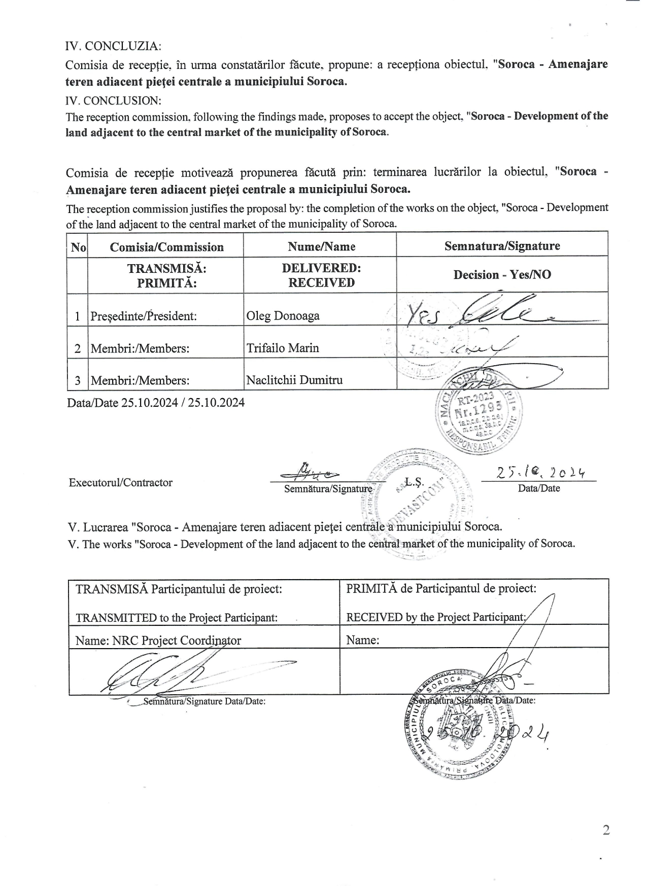 În continuare, procesul-verbal de recepție la terminarea lucrărilor, semnat pe 25 octombrie 2024, confirmă finalizarea lucrărilor de amenajare a terenului adiacent Pieței Centrale.