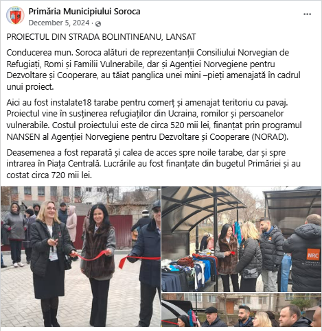 Pe 5 decembrie 2024, a avut loc evenimentul de dare exploatare a celor 16 tarabe amenajate la intrarea în Piața Centrală a municipiului Soroca, destinate vânzătorilor ambulanți din localitate și refugiaților. Costurile lucrărilor, în valoare de 521.000 de lei, au fost acoperite de Guvernul Norvegiei și realizate în perioada iunie – octombrie 2024. Primăria municipiului Soroca a fost responsabilă de amenajarea terenului aferent locației unde au fost instalate tarabele. La eveniment au participat reprezentanți ai investitorului norvegian, ai constructorului – Consiliul Norvegian pentru Refugiați, precum și viceprimarii municipiului Soroca: Anna Ojog, Ghenadie Mânăscurtă și Veaceslav Ursu.