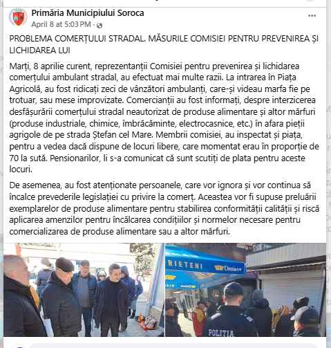 „Una dintre problemele importante care necesită soluționare este comerțul stradal neautorizat. Pentru a adopta măsuri mai eficiente în acest sens, a fost convocată, prin dispoziția doamnei primar Lilia Pilipețchi, o comisie formată din reprezentanții tuturor structurilor statale competente. Am încercat să informăm toți cetățenii implicați în această activitate că, potrivit planului urbanistic al municipiului, în zona centrală — mai exact în scuar — se preconizează lucrări de reconstrucție și amenajare a unui parc. În acest context, este necesar ca persoanele care desfășoară activități comerciale stradale să fie relocate în piața agricolă, unde există condiții adecvate și legale pentru astfel de activități”, a spus Veaceslav Ursu, viceprimarul mun. Soroca.