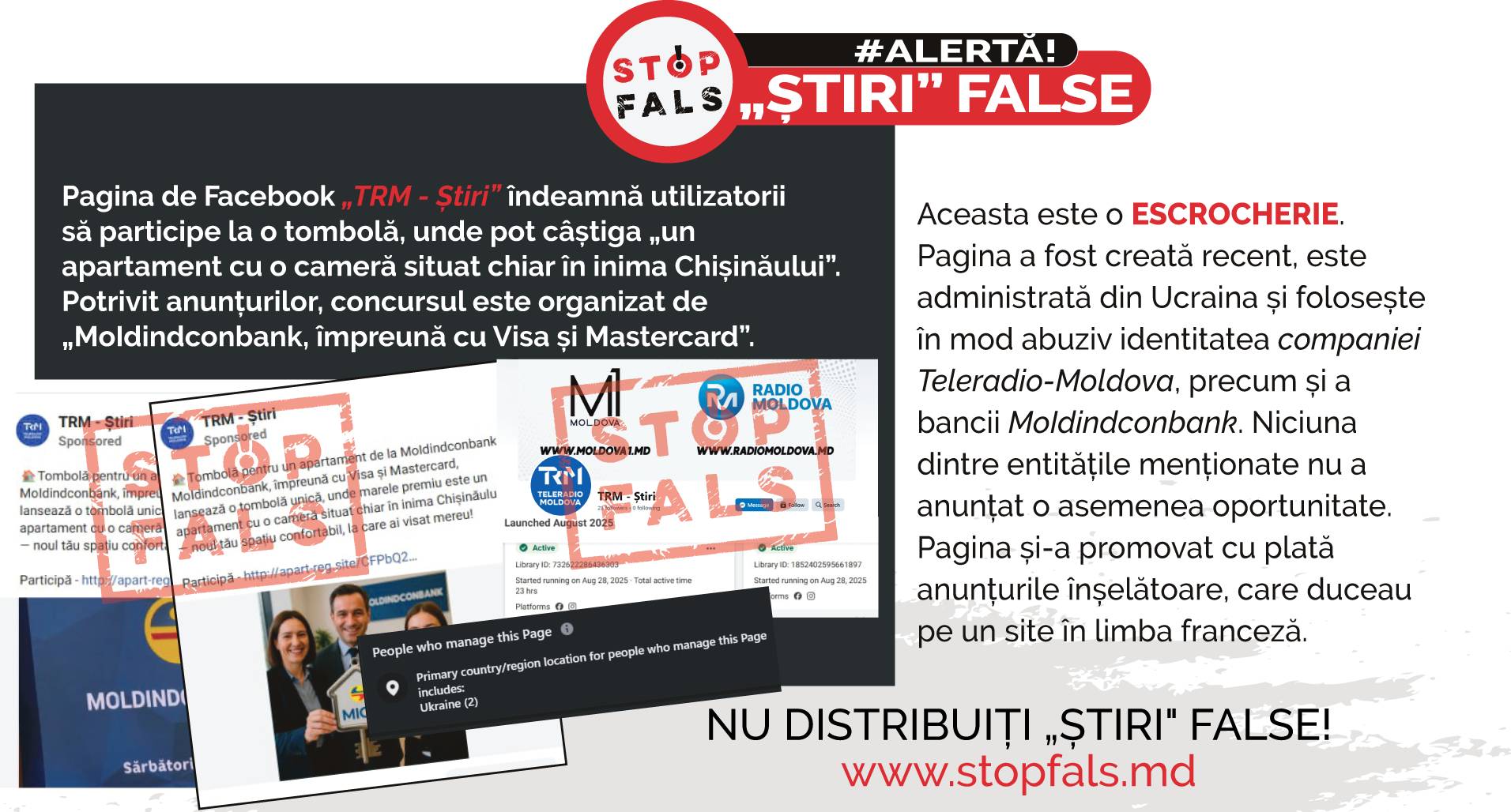 Pagina de Facebook TRM – Știri îndeamnă utilizatorii să participe la o tombolă, unde pot câștiga „un apartament cu o cameră situat chiar în inima Chișinăului”. Potrivit anunțurilor, concursul este organizat de „MoIdindconbank, împreună cu Visa și Mastercard”.