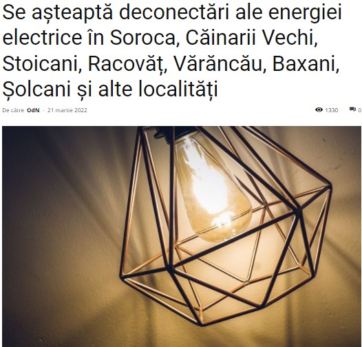 Locul 4: Se așteaptă deconectări ale energiei electrice în Soroca, Căinarii Vechi, Stoicani, Racovăț, Vărăncău, Baxani, Șolcani și alte localități , cu 1330 vizualizări.