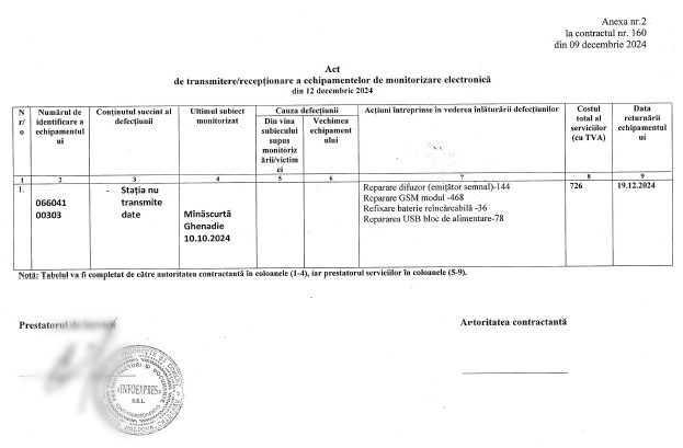 Cu toate acestea, Inspectoratul Național de Probațiune, a solicitat încasarea sumei prin intermediul instanței de judecată, doar că în fața instanței, aceeași instituție a prezentat un alt act de efectuarea a reparațiilor, cu un conținut diferit, ce nu fusese anterior adus la cunoștința clientului meu și suplimentar a tăinuit actul de recepționare a dispozitivului de la clientul meu.
