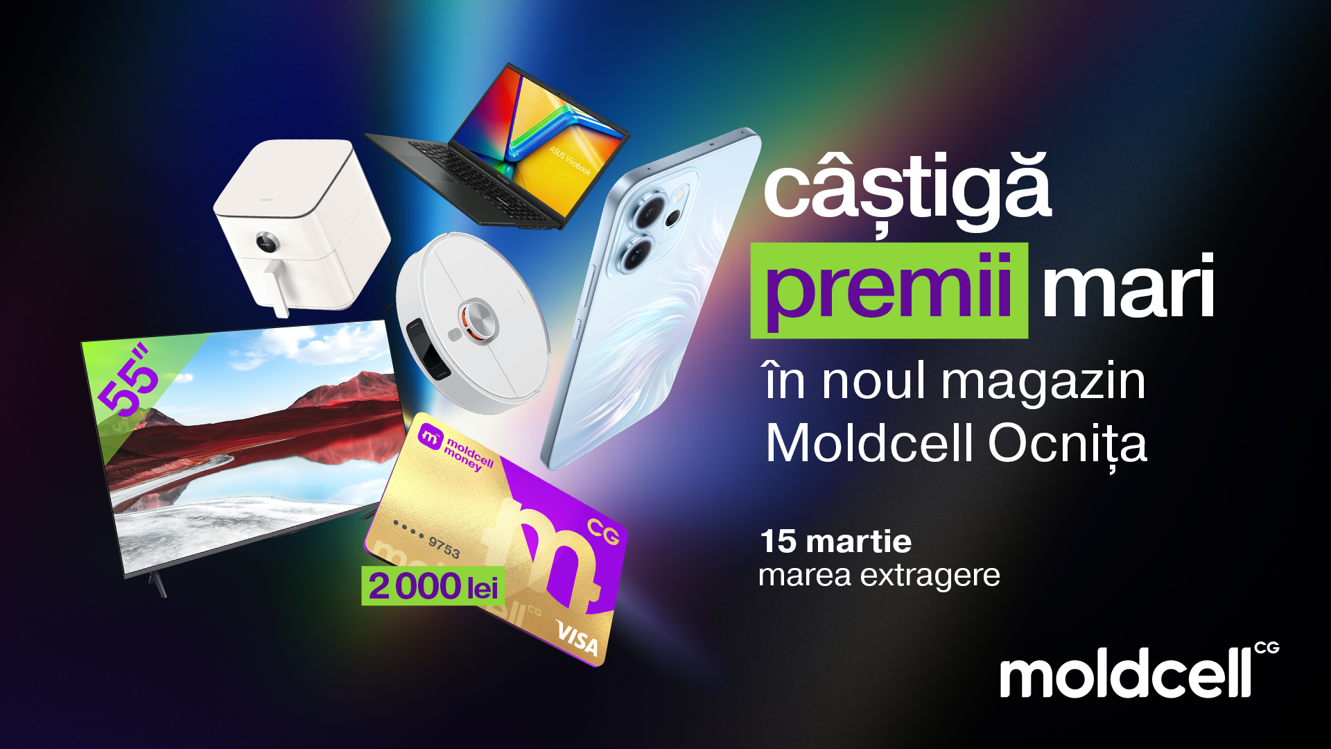 La Marea Extragere din 15 martie vor fi desemnați 15 câștigători. Printre premiile puse în joc se numără 5 premii a câte 2000 lei și 5 premii a câte 1000 lei, transferate pe Moldcell Visa Card, precum și produse atractive precum Xiaomi Air Fryer, Xiaomi TV A Pro 55”, laptop ASUS VivoBook Go, Xiaomi Robot Vacuum S20+ și smartphone OPPO Reno 14F 5G.