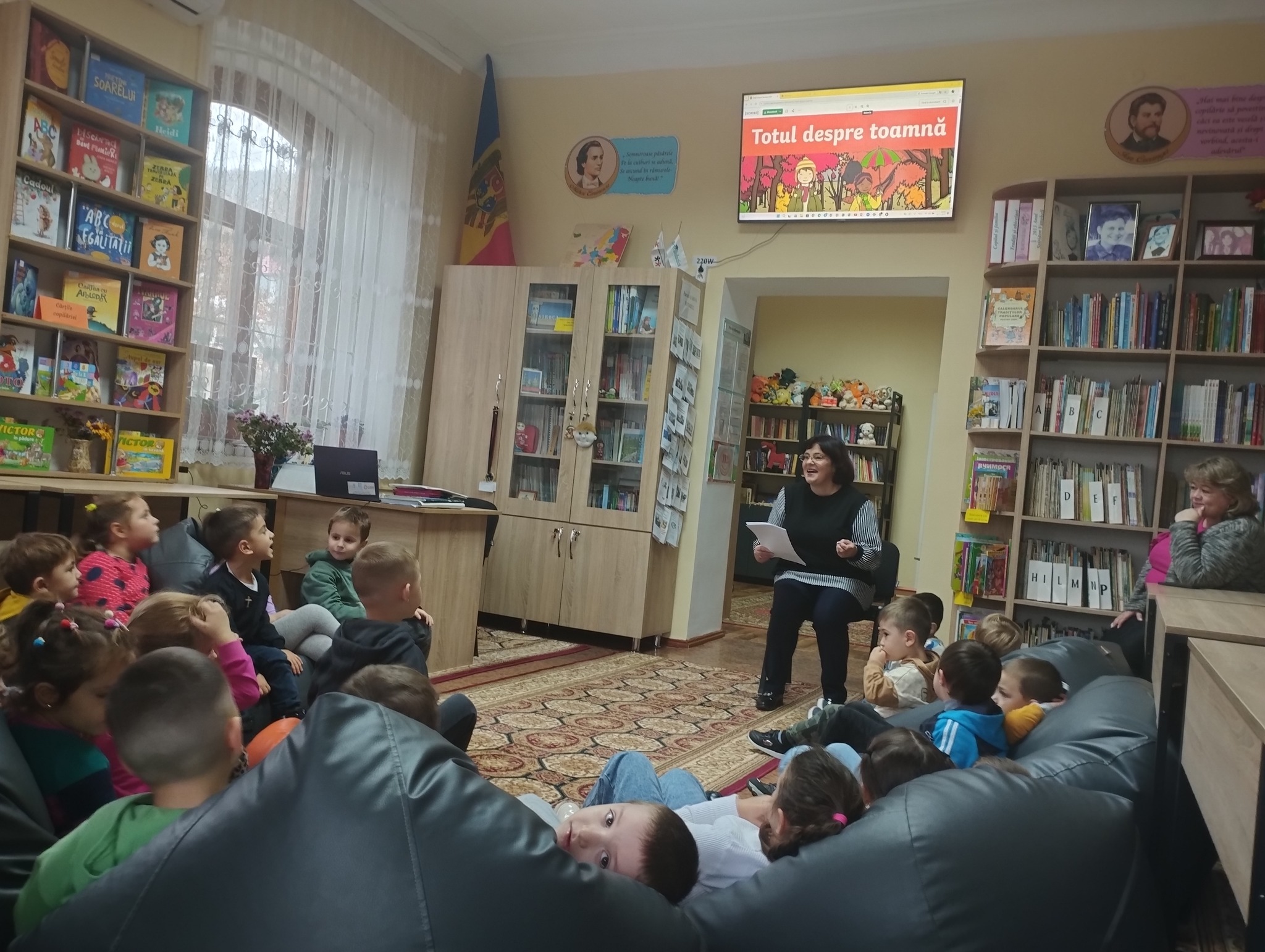 Îndrumați de bibliotecarele filialei, micuții au aflat curiozități despre acest frumos anotimp, au ascultat melodii tematice, au participat la ghicitori și la un dialog interactiv în cadrul prezentării „Totul despre toamnă”.