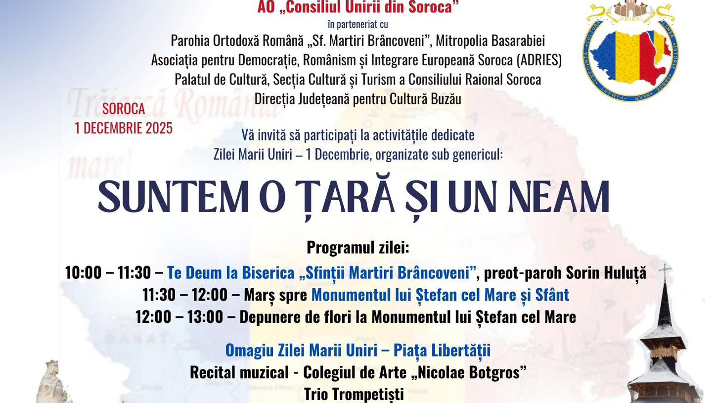 Comunitatea din Soroca este invitată să participe la un program variat de manifestări dedicate Zilei Marii Uniri, organizate pe 1 Decembrie 2025 cu implicarea AO „Consiliul Unirii din Soroca”, Parohiei Ortodoxe Române „Sfinții Martiri Brâncoveni”, Asociației pentru Democrație, Românism și Integrare Europeană Soroca (ADRIES), Palatului de Cultură și Secției Cultură și Turism a Consiliului Raional Soroca, împreună cu Direcția Județeană pentru Cultură Buzău.